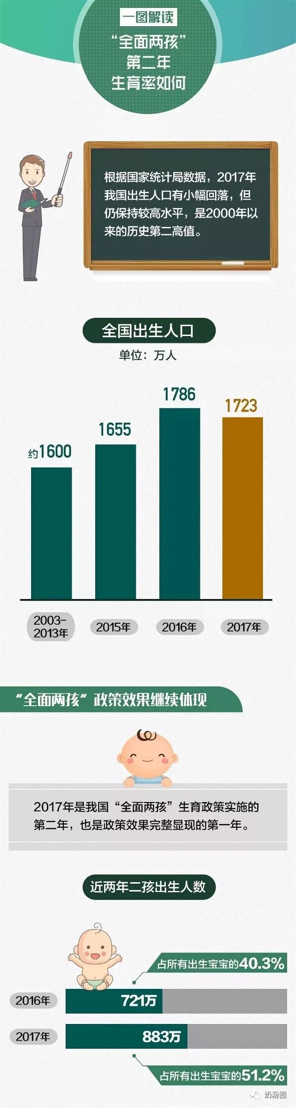 自2016年1月1日“全面兩孩”政策實施已經兩年有余。近日,國家統計局發布數據顯示,2017年,我國“全面兩孩”政策的實行效果繼續顯現:2017年全年,二孩數量上升至883萬人,比2016年增加162萬人;二孩占全部出生人口的比重達到51.2%,比2016年提高了11個百分點。雖然我國出生人口數量和出生率兩個指標同時出現了下降,但這兩項數據仍是2000年以來的歷史第二高值。