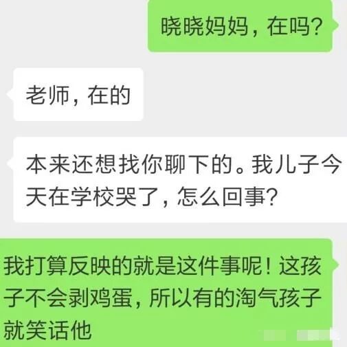 不久前,在網上看到一位小學老師分享的聊天截圖,這位老師有個五年級學生曉曉,因為不會剝蛋殼被其他同學嘲笑了,本來他打算借此機會讓學生家長培養一下孩子的自理能力,沒想到孩子媽媽并沒覺得這是什么大問題。