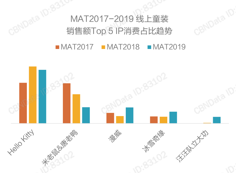一個IP如何選擇?一是IP和時代的結合,價值觀是否還有價值;二是IP有無生命力、新玩法等。從IP營銷來看,我們要看Z世代人群最核心想要什么。 隨著消費者的變化,性價比不再是消費者購買商品的重要參考要素,相反“有趣但無用”的商品更受90后、00后消費者的歡迎。呈現“買我所愛”的消費特征,IP是一群人的興趣點的集合,IP能夠帶來其背后的粉絲,撬動流量。 童裝屆越來越多的跨界聯名行動顯示出IP的重要性。例如2019年3月安奈兒x人民教育出版社推出的國潮春夏聯名系列、2019年7月YeeHoO英氏與天貓新文創、【UCCA尤倫斯當代藝術中心】的聯合畢加索啟發系列…… 童裝跨界最火IP形象 童裝跨界合作,聯合時尚IP也是常見玩法。根據CBNData消費大數據顯示:2019年線上童裝銷售額最高的童裝IP依次為Hello Kitty、漫威、米老鼠&唐老鴨、冰雪奇緣、汪汪隊立大功。值得注意的是米老鼠&唐老鴨首次被漫威系列超越,占比逐年下降;汪汪隊立大功作為一個新興IP,消費占比猛增,是一潛力IP;Hello Kitty興盛幾十年,即使2019年有下降趨勢,但是依然遙遙領先其他IP。