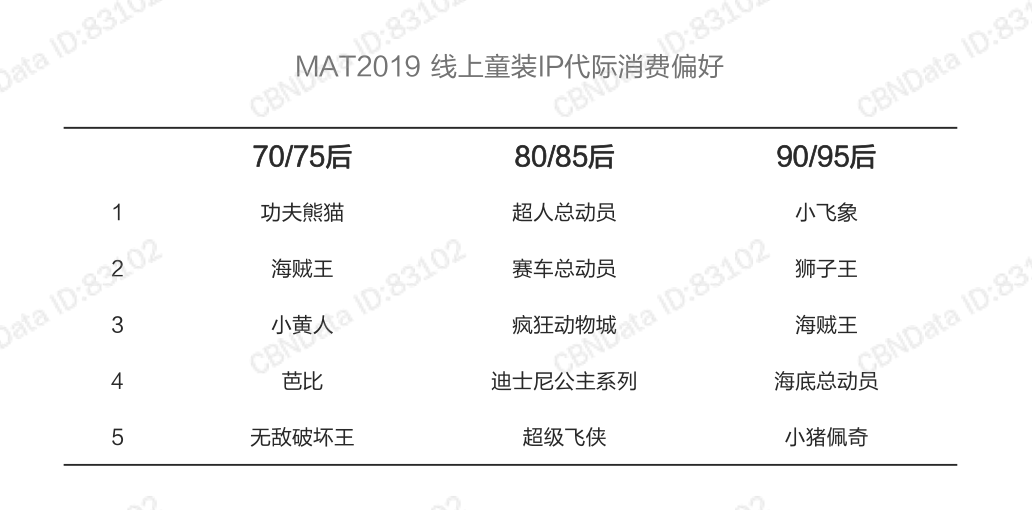 CBNData消費大數據,2019年童裝IP銷售額增速TOP10的幾大IP形象如圖。增速第一的童裝IP面包超人,一個在1988年就出現的動畫形象,在2019年“煥發新生”,增長速度遠超其他IP;僅次于面包超人的童裝IP汪汪隊立大功、賽車總動員都是來自美國,另外其他童裝IP也大多出自美國。由此可以看出,國產動漫依然比較弱,在IP變現上也缺乏運作能力。 代際消費偏好 現階段,新生代媽媽的消費觀念、消費能力不斷提升,與70/75后、80/85后形成不同審美和追求。這與當時接觸和受影響的環境息息相關。雖然90/95后成為核心消費用戶,但是隨著二胎政策的開放,我國的二胎出生人口也在不斷增長。這其中做出貢獻的更多的是80/85后,所以這一人群的審美偏好也非常重要。根據CBNData消費大數據顯示:2019年線上童裝IP代際消費偏好,70/75后偏好功夫熊貓,80/85后偏愛超人總動員,90/95后更愛小飛象。