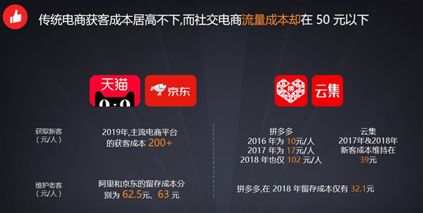 隨著人口紅利、傳統電商流量紅利的消失,獲客成本越來越高昂,商家如何挖掘新機會獲取增長?有贊學院院長閆冬表示在私域流量化已成定局,在社交新零售時代,商家要不斷深耕私域流量、精準借勢及場景延伸,才能帶來更大的價值。以下為精彩演講內容: 私域流量化已成定局 今天跟大家聊一下2020年以及未來幾年都不能錯過的事情——私域流量,私域流量更多是培養我們自己的超級用戶,服務好他們才能帶來更多的客戶。 近年來線上電商獲客成本逐年升高,線上流量紅利逐漸消減,線上零售企業開始積極向線下滲透以挖掘流量入口。傳統電商獲客成本居高不下,而社交電商流量成本卻在50元以下。2019年,主流電商平臺的獲客成本200+元/人,其中阿里和京東的留存成本分別為62.5元、63元。大家可以看到這個流量成本非常貴;再看社交型電商平臺,拼多多2018年獲客成本102元/人,其留存成本為32.1元,而云集2017&2018年新客成本維持在39元。