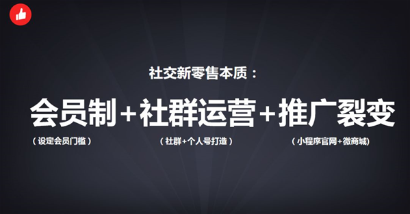 社交新零售本質是會員制+社群運營+推廣裂變 流量是一切生意的本質。如果你有門店一定要讓客戶花低成本的價格,讓他到店來體驗,建立信任交易,成為自家魚塘后,可關注小程序、公眾號等,留存到線上之后,再幫你傳播裂變。此外,微信生態絕對是布局私域流量很重要的載體,未來幾年它也是最好的,F在微信小程序月活躍達到了3億,整個微信的月活有11億,這些巨大的流量,就是我們可以做事情的一些來源,因為有流量的地方就有商機。 以前我們做生意只關注客量、轉化率、客單價這三個詞,但現在運營的過程當中發生了巨大的變化,在于我們有沒有把用戶當做流量來重點運營轉化率的事情,有沒有把你的客戶當做一個真正的人,然后挖掘這個人背后可以給你帶來的更多價值。所以有門店的老板要記得,你的導購跟你的消費者之間建立的這種社交關系鏈越好,生意就越好,未來絕對是這樣的過程。 社交新零售本質是會員制+社群運營+推廣裂變。首先讓消費者成為我們的會員或者粉絲,然后是社群運營,微信絕對是最好的生態,其中微信好友數超過5000的個人號已達到180萬,現在微信好友的數量已經快突破5000了,通過掃碼進群的人數從原來的100人升級成現在的200人了。微信雖然不在個人號上面做一些鼓勵的動作,但它在技術和真正的功能上面為大家開辟了更多的可能。最后是推廣裂變,承載的工具可以是小程序、微商城等。