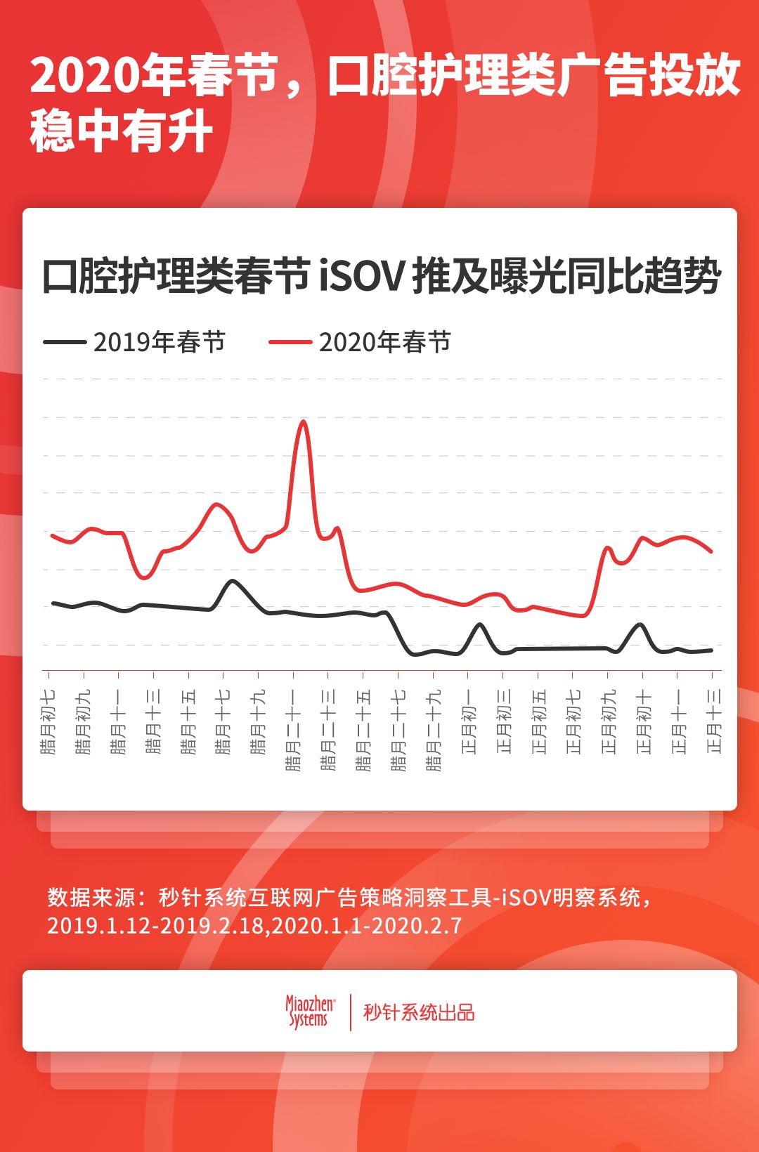 值得注意的是,兩大品類的廣告曝光高峰期較1月20日疫情爆發,間隔長達11-13天,期間,廣告曝光量同比2019年相差并不大,若品牌能在此間隔期率先相應,加大廣告投放,勢必將取得更好的效果。 此外,除了擔當防護重任的個護、家清行業,其他清潔品類也值此增加了廣告投放力度,iSOV明察數據顯示,口腔護理品牌的推及曝光曲線也呈現出和個護、家清行業類似的趨勢,投放在經歷了節后短暫的回落后,于2月1日(正月初八)逆勢沖上高位,并在此后保持穩中有升的態勢。