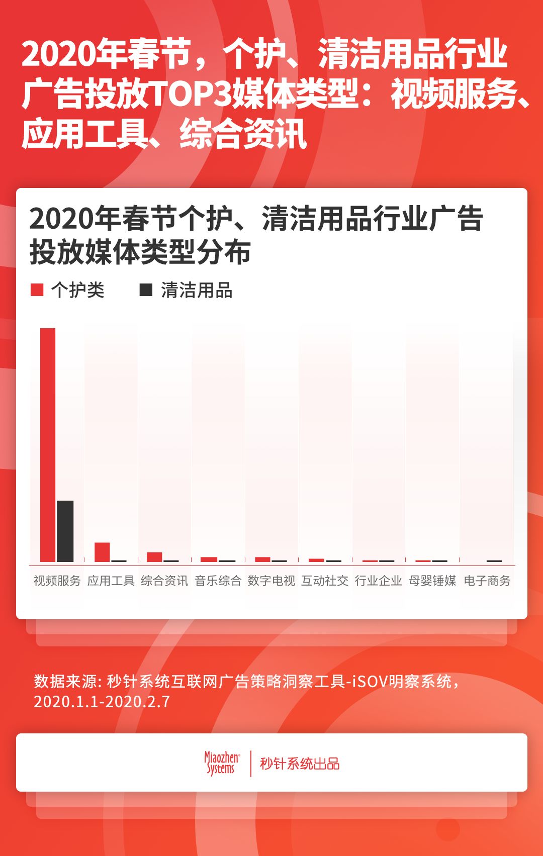 1月20日專家肯定新型冠狀病毒存在人傳人后,飛沫傳播、接觸傳播及糞口傳播等傳染途徑相繼被確認,“戴口罩,不出門,多通風”之余,“勤洗手”也成為人們日常“戰疫”必備。個護及家庭清潔產品作為自我防護的重要屏障,需求迎來爆發性增長,但同時,不少產品的功效及成分也開始吸引消費者的關注,質疑聲也隨之而來。 人傳人及接觸傳播證實,個護廣告投放同比最高漲幅達365%,視頻服務、應用工具、綜合資訊為TOP3渠道。 春節,作為一年一度闔家團聚的時節,是家庭消費的高峰期,歲末的例行大掃除會使家庭清潔消費上漲,相關的廣告投放也順勢增加,春節后需求、投放則相應回落,2019年春節期間個護及家庭清潔廣告推及曝光就符合這樣的趨勢。 但2020年,由于疫情與春節同期,需求的爆發使得這一曲線發生明顯變化,明察數據顯示,2020年春節后,個護及家庭清潔類廣告iSOV推及曝光同比大幅增長。其中,2月1日(正月初八)為個護類投放最高峰,單日廣告曝光較前一日直線上揚,同比2019年漲幅達365%,此后,廣告曝光量雖有些許回落,但同比仍處在較高水平。家庭清潔類投放的爆發雖來的晚了些,但推及曝光曲線也出現類似變化,較去年同期接近于0的投放,2月4日(正月十一)投放量陡增。