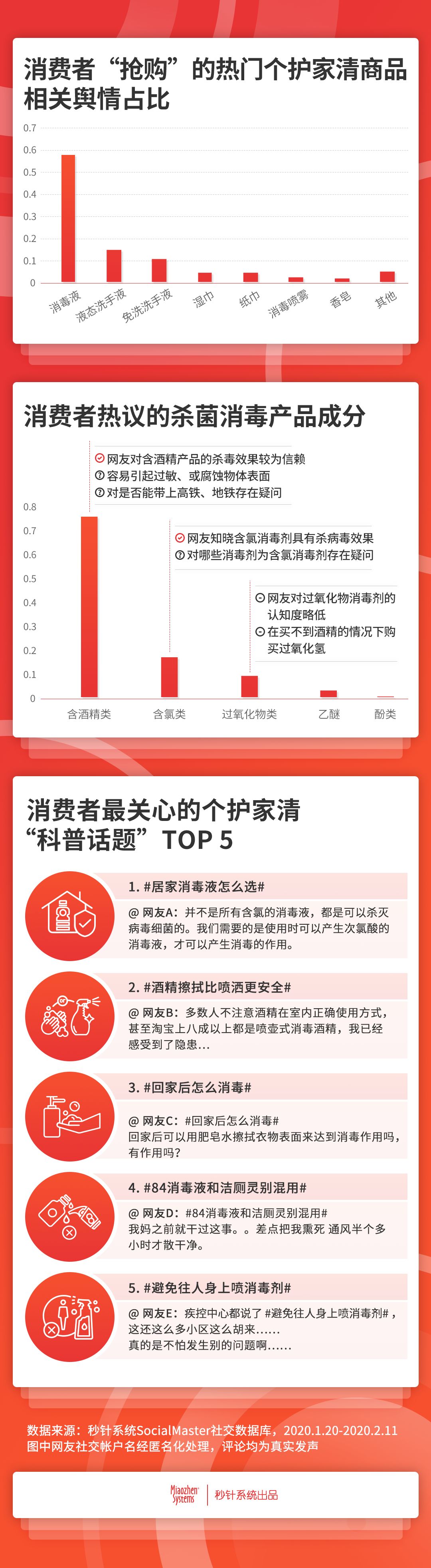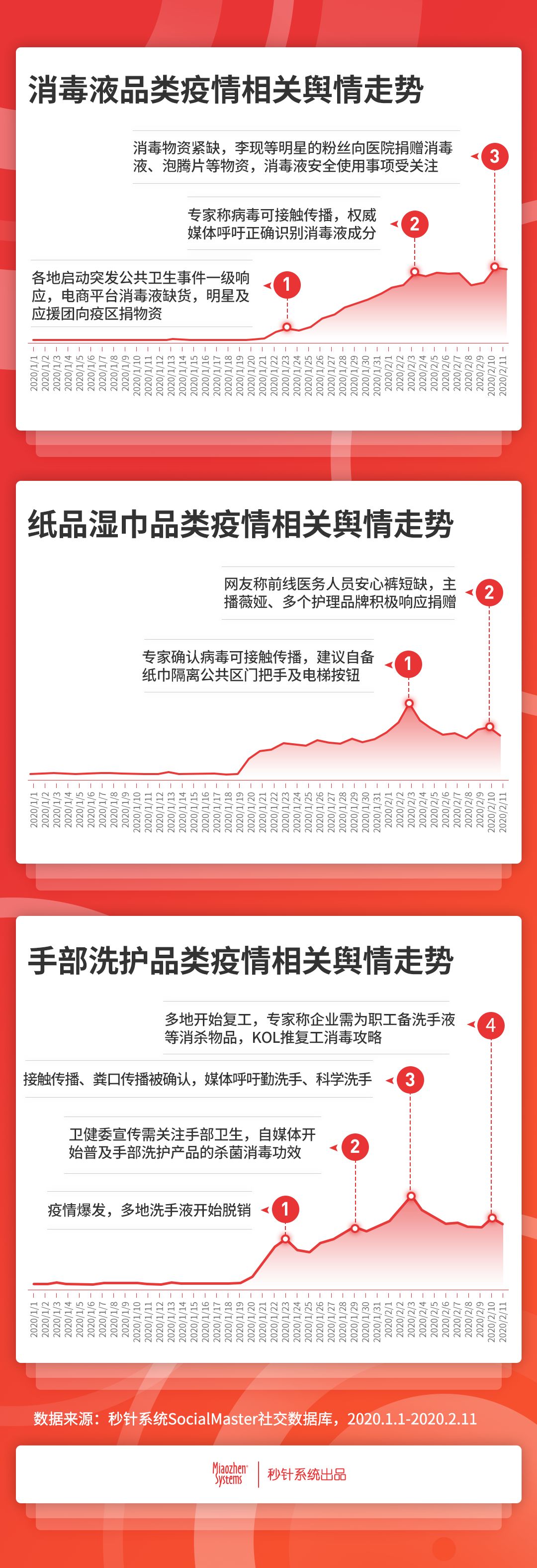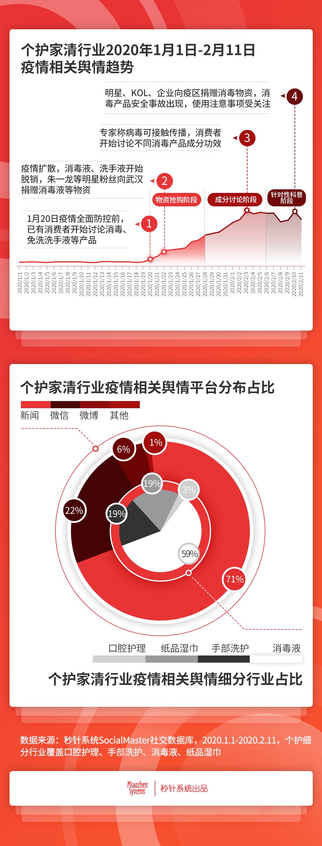 搶購到成分質疑再到科普,消費者相關輿情分三階段爬升 消費者輿情方面,雖然“戰疫”行動正式打響是在1月20日之后,但秒針系統SocialMaster社交數據顯示,在此之前,消費者就已經開始討論消毒劑、免洗洗手液等防護產品。1月20日后,個護家清行業疫情相關討論開始不斷攀升,截止2月11日,輿情總量的最大峰值已是1月初最低值的60倍。 相關討論中,消毒液最受關注,占比近6成,手部洗護及紙品濕巾關注度比肩,分別占比19%。從消費者輿情的媒體平臺分布來看,新聞資訊類媒體最為活躍,占比超7成,其次是微信,占比22%。 具體來說,除了1月19日消費者開始討論消毒殺菌,全平臺輿情相繼又經歷了3個關鍵發酵點,及3個討論階段: 物資搶購階段:時間為1月20日至27日。隨著疫情爆發,消費者開始大量搶購個護及家庭清潔用品,多地出現相關產品脫銷情況。與此同時,公共交通開始定期消毒,多位明星的粉絲向疫區捐贈消毒、洗手液等物資; 成分討論階段:時間為1月28日至2月5日。搶購清潔用品的同時,大量有效防護科普貼出現,輿論轉向討論消毒液、洗手液成分,關注相關產品是否能有效殺毒,個別品牌的效能被質疑; 針對性科普階段:時間為2月5日至11日。隨著各地相繼復工,消毒液安全事件出現,針對性的科普貼大量涌現。與此同時,明星粉絲、KOL及個護品牌紛紛向疫區捐贈物資。作為獨立的輿情版塊,科普類話題的廣受關注,體現出學習型消費者在“搶購”之余,理性思考能力的提升,包括對成分本身的分析,不同成分應用方式和場景的說明和討論等等。