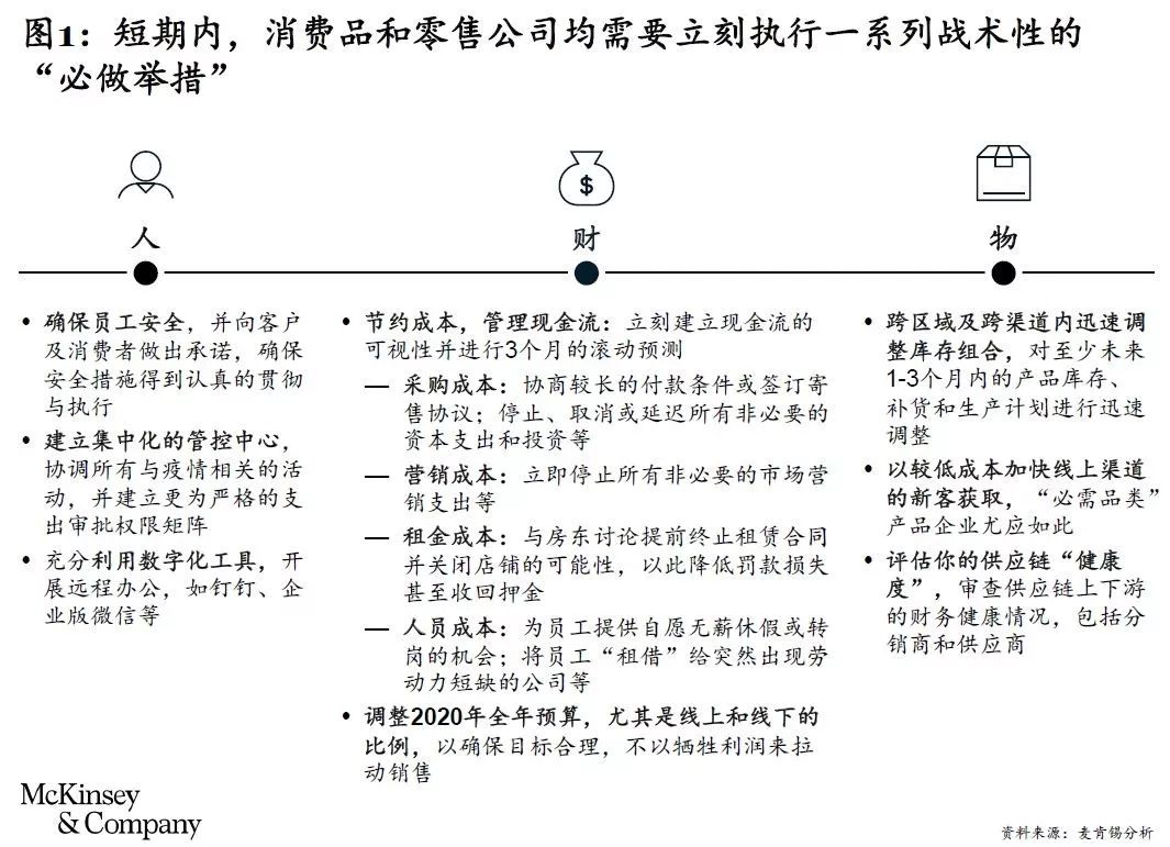 -01- 麥肯錫咨詢公司 近日,麥肯錫發布報告《消費品與零售企業的戰術戰略組合拳》中指出:此次疫情對零售行業的影響大于2003年SARS帶來的影響,但中國消費品和零售企業仍可通過迅速行動、打好戰術和戰略組合拳等方式,度過逆境。 麥肯錫認為,鑒于消費在中國GDP中的占比大幅攀升,預計此次消費品與零售行業仍將首當其沖,但對行業內不同企業的影響程度不盡相同。 消費品企業與零售企業之間的影響差異:擁有雄厚實體店基礎和大量一線員工的零售商可能會面臨更大的財務壓力,尤其是人力成本及租金。而在華擁有龐大銷售團隊和大量制造業務的消費品公司也將面臨同樣的壓力,但更主要集中在供應鏈方面。 產品類別之間的影響差異:非剛需品類(如服裝和美容),企業面對的是驟降的客戶需求,及隨之而來的現金流壓力。如何最大程度地保留現金,保持公司的正常運營,并準備疫情結束后的商業計劃以重新獲得客戶,恢復生意等,均是管理層們面臨的挑戰。 麥肯錫建議企業關注短期與中長期兩個方面。從短期而言,企業要采取一系列緊急戰術性舉措,克服陣痛;從中長期而言,企業應著眼危機后的增長和復蘇戰略,放眼未來,積極布局 “新常態”,建立自身的競爭優勢。