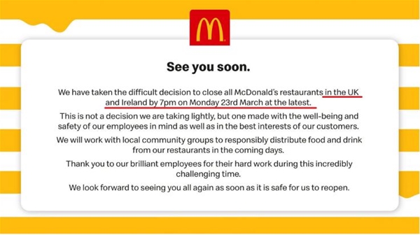隨著全球疫情發展,為了遏制疫情持續擴散,越來越多的國家像我們學習,封城、停產、關門,“閉店狂潮”現已席卷全球各行各業。 01 多國關閉餐館 麥當勞門店也停了 為避免新冠病毒傳播,3月20日,英國首相約翰遜在每日疫情發布會上宣布,全國的酒吧、餐廳、劇院、電影院、體育館等所有非必需公共場所將于周五晚無期限關閉,但餐館仍可提供外賣服務。 根據此項規定,麥當勞考慮到員工的福祉與安全以及客戶的最大利益,決定于3月23日晚上7點之前關閉其在愛爾蘭和英國的所有餐館,同時還與社區團體合作,在未來幾天內發放食品和飲料,但具體的開店時間要看疫情穩定情況。