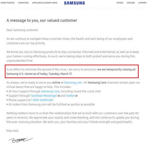 目前,優衣庫已于3月12日起關閉了在意大利的唯一門店,3月13日起關閉了西班牙的全部4家門店,3月14日起關閉了法國的全部22家門店。迅銷集團表示,因為考慮到工作人員及顧客的健康安全,所以做出了這一決定。至于何時能夠恢復營業,需要根據各國疫情狀況進行判斷。 不過優衣庫在中國境內的多家門店已經逐漸恢復營業,750家優衣庫門店只有30家尚未恢復營業,湖北以外的大部分門店均已重新開放。 據商業媒體Business Insider不完全統計,截至3月17日,已有超過30家零售商宣布了在美國暫停營業的通知,包括服裝品牌Levi’s、Madewell、Calvin Klein等,大部分門店的雇員都會得到失去工時的公司補貼。 04 三星全球范圍停工停產 為了遵守印度政府的防控方針,三星旗下位于印度IT服務輸出的主要樞紐——諾伊達的智能手機工廠將暫停生產至本月25日,該工廠于2018年7月建成,是三星在全球最大的手機工廠,可實現每年最高1.2億臺手機的產量。 除在印度的工廠外,3月20日三星也宣布,由于歐洲疫情持續爆發,將于3月23日開始暫時關閉位于斯洛伐克的電視機制造廠,但目前三星在波蘭的家用電器工廠和匈牙利的電視廠尚在正常運作。 實際上,早在上周,三星就在美國和加拿大網站上發布公告稱,由于公司將員工、客戶和合作伙伴的健康和安全是重中之重,為盡量減少新型冠狀病毒的傳播,于3月17日起關閉美國和加拿大的所有門店。同時,公司還強烈建議員工盡可能在家工作。