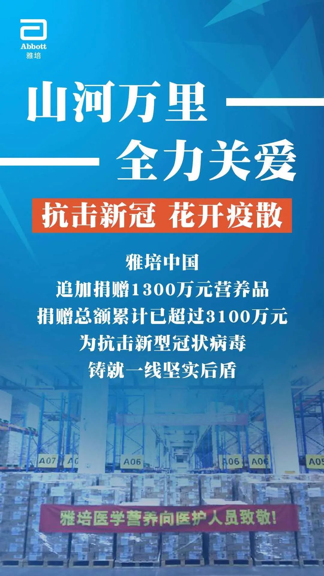 今天,醫療健康公司雅培宣布,即日起追加捐贈價值超1300萬元的兒童營養品和醫學營養品,持續關愛奮戰在一線的醫護人員及其子女,和受疫情影響的兒童。