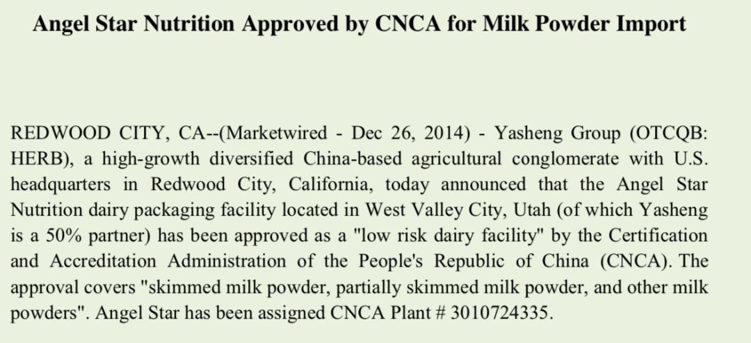 Angel Star Nutrition,位于美國猶他州的W Valley City(西瓦利城)。早在2014年,該廠就曾獲得中國認監委的注冊批準,不過當時的注冊產品并不包括嬰幼兒配方乳粉。 公開資料顯示,有中國業務背景的亞盛集團在Angel Star Nutrition中持股50%。 公開資料顯示,亞盛集團成立于30多年前,總部設在美國加州紅木城,主要在中國西北地區從事農業業務,包括大田作物、蔬菜、水果、特種作物、種子和家禽養殖等。亞盛在2014年的一份資料中說,自己還是麥當勞、肯德基、青島啤酒和百事公司等企業的農產品供應商。