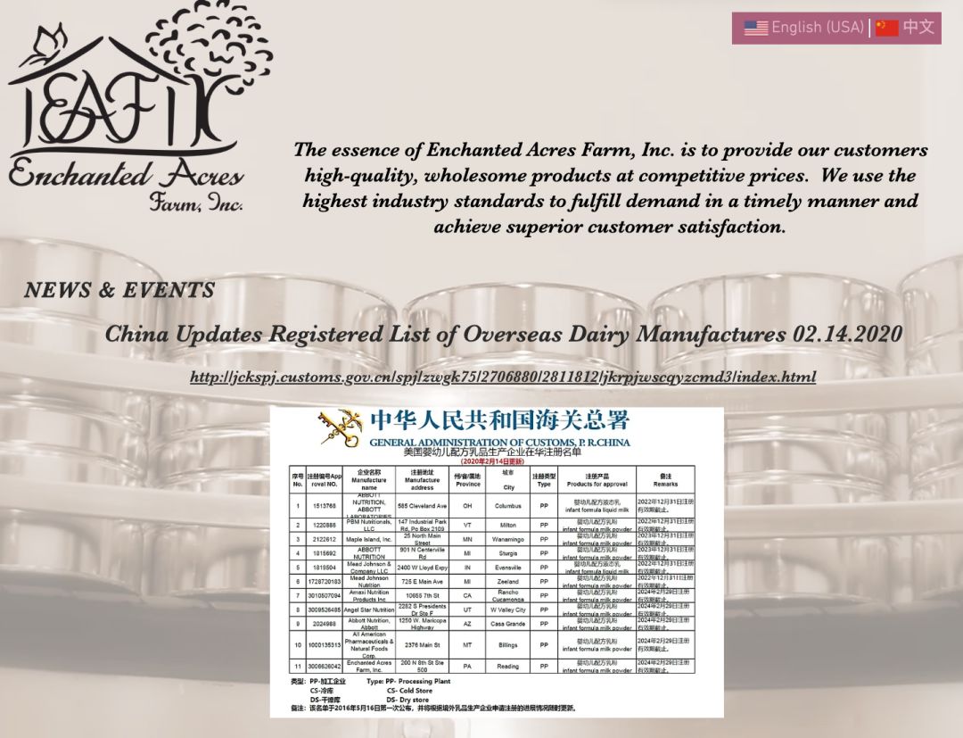 雅培旗下一家名為“Abbott Nutrition, Abbott Laboratories”的工廠也獲得注冊資格。資料顯示,該工廠位于美國亞利桑那州的卡薩格蘭德市。 在當地媒體2017年發布的一則關于雅培上述工廠的消息中,雅培工廠總監Troy Rosenow表示:“在卡薩格蘭德,我們每天運出和運入的營養品中大約有一半是面向國際市場上的消費者和患者。” 雅培此前一家注冊了嬰幼兒配方液態乳的工廠并未出現最新名單中。海關發布去年12月消息曾表示,在2019年底注冊期屆滿時,雅培主動提出注銷一家美國工廠的注冊資格,該廠注冊產品為嬰幼兒配方液態乳。 All American Pharmaceuticals & Natural Foods Corp.位于美國蒙大拿州的Billings(比靈斯)。公開資料顯示,這家位于Billings的工廠有150,000平方英尺。 其官網資料顯示,該公司既研發和生產自己的食品和營養品系列,也生產自有品牌及為眾多客戶生產定制配方的產品,其創始人兼執行科學家是Jeff Golini博士。除了嬰幼兒配方乳粉,這家公司還生產面霜、乳液等美妝產品,以及草藥提取物等產品。 最后,美國注冊名單中新增的還有一家Enchanted Acres Farm, Inc.,位于美國賓西法尼亞州的Reading(雷。。 該公司將海關總署近日更新的注冊名單顯眼地掛在了首頁。官網資料顯示,該企業成立于2002年,并在2010年搬遷至雷丁。這家食品工廠占地400,000平方英尺,位于主要航運港口附近,交通便利。 據官網介紹,該公司具備“完整的制造和供應鏈解決方案”,生產一至三段的嬰兒配方奶粉和營養粉飲品。所有產品均在美國當地生產。據悉,該公司的配方奶粉符合FDA、CFD和CFD和CNCA(中國認監委)的要求。